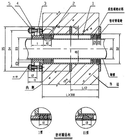 3、套管穿墻處如遇非混凝土墻壁時,應(yīng)局部改用混凝土墻壁,其澆注范圍應(yīng)比翼環(huán)直徑(D5)大200,而且必須將套管一次澆固于墻內(nèi)。